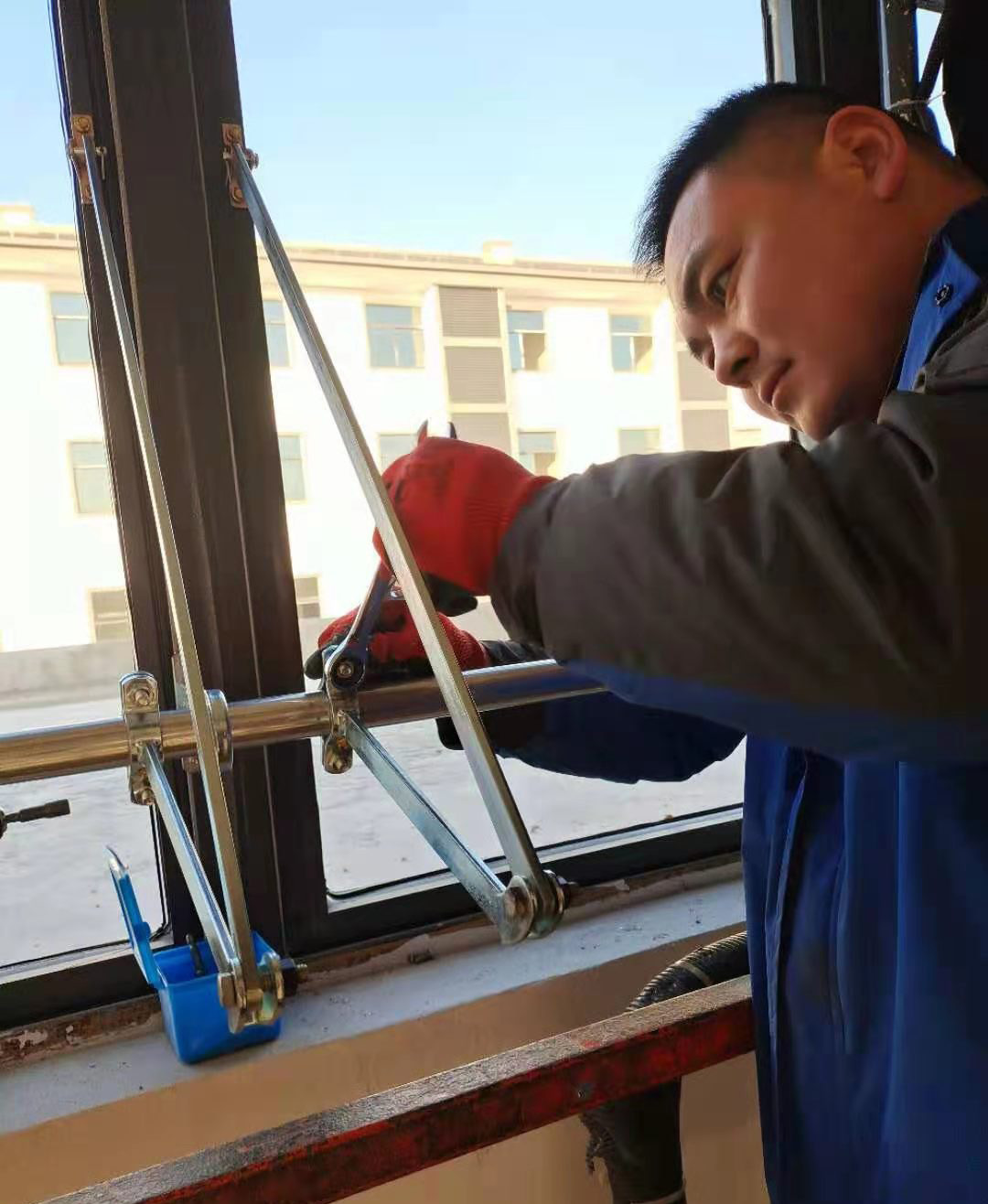 此次電動排煙窗工程采用曲臂聯動電動開窗器,由螺桿式電動開窗器驅動。
