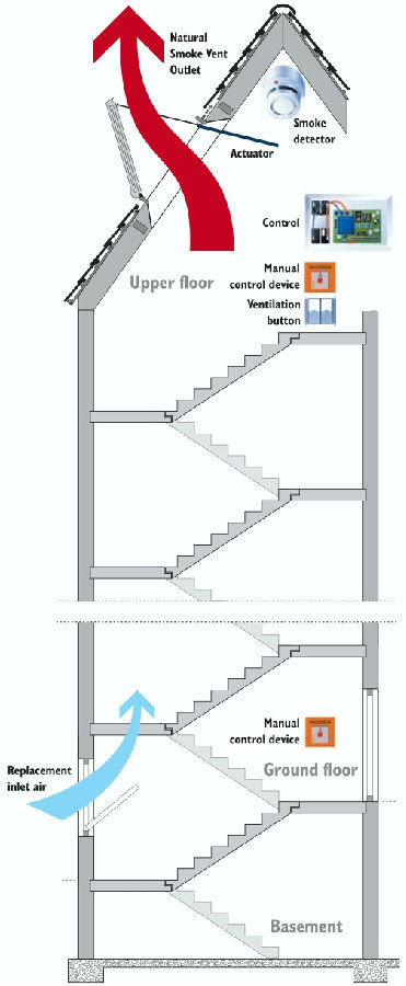 由智能控制箱、消防緊急按鈕、煙霧感應器、墻裝開關、遙控器、風雨感應器、開窗器等組成,智能消防控制箱與建筑的消防控制室相連,并連接煙霧感應器,消防緊急按鈕,發(fā)生火災時無論手動報警信號還是自動報警信號傳送至控制箱,控制箱均立即自動命令下級開窗器進行開窗動作,從而迅速將室內的有毒煙霧排出。