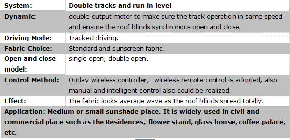 應(yīng)用場(chǎng)所:彎曲、傾斜或水平的中小型遮陽場(chǎng)所,如酒店、咖啡廳等玻璃頂。